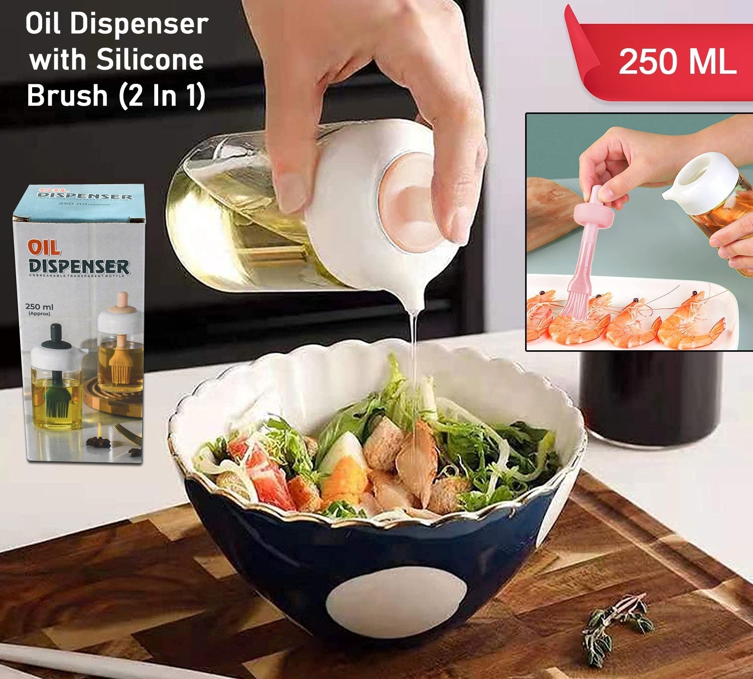 2in1 Oil Dispenser Bottle, Oil Dispenser with Silicone Oil Brush, Wide Opening Oil Bottle, Oil Container For Cooking Silicone Brush for BBQ Grill Kitchen BPA Free Dishwasher Safe (1 Pc / With Brush / 250 ML Approx)
